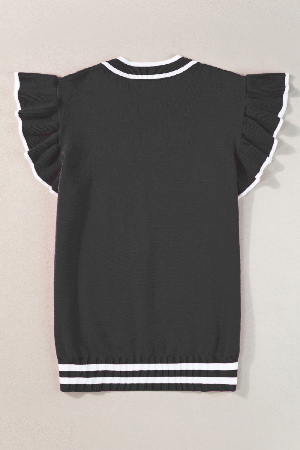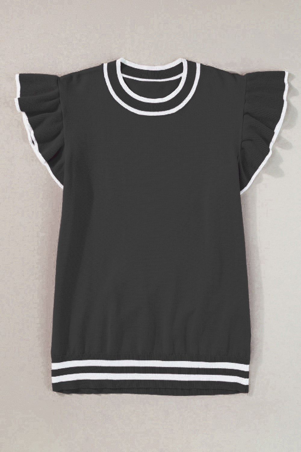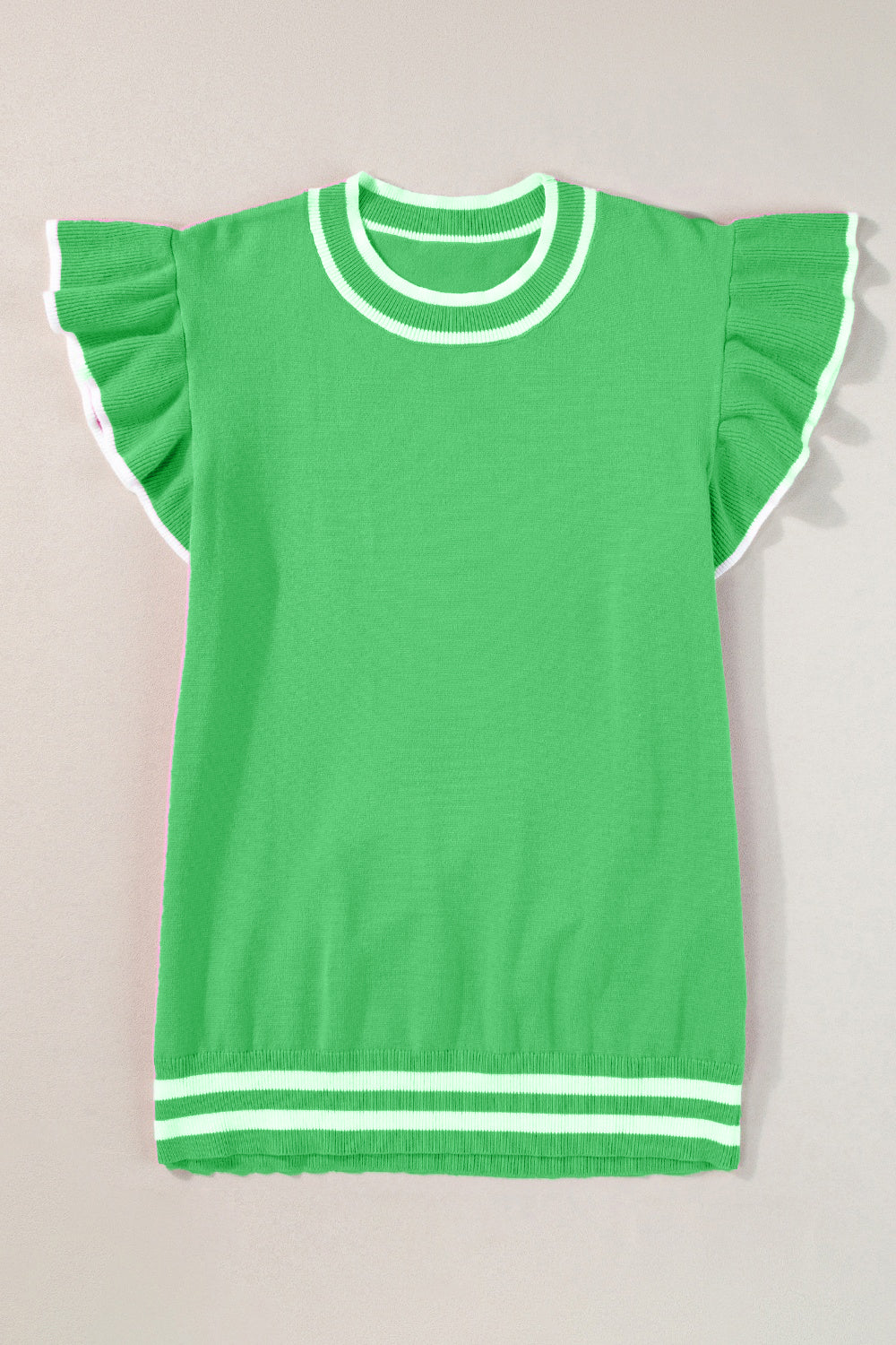 Este moderno top de punto acanalado con cuello redondo y mangas casquillo es perfecto para cualquier ocasión informal. Con sus exclusivos volantes y su cómodo ajuste, siempre te verás y te sentirás genial.